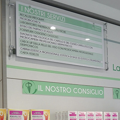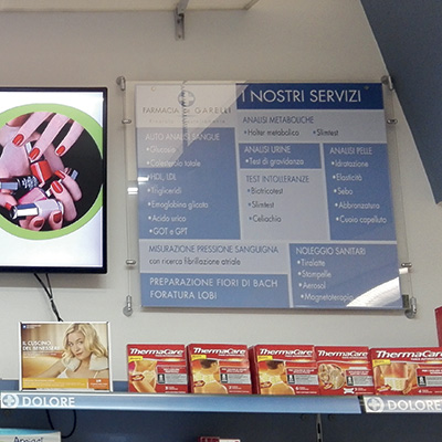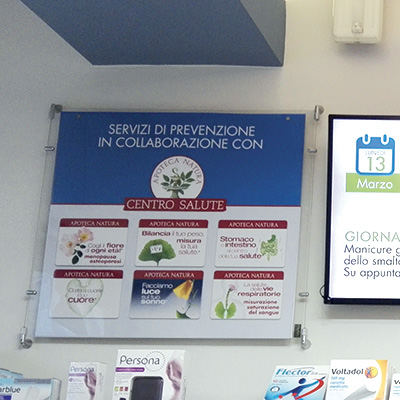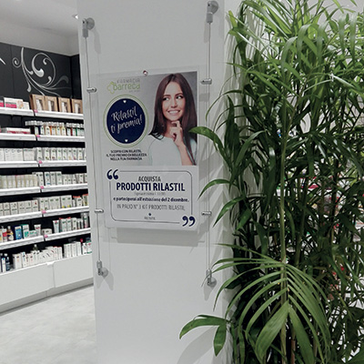 Tasche in plexiglass porta comunicazione, complete di kit per il fissaggio su astine o cavi, permettono un rapido e semplice aggiornamento della comunicazione mediante poster.