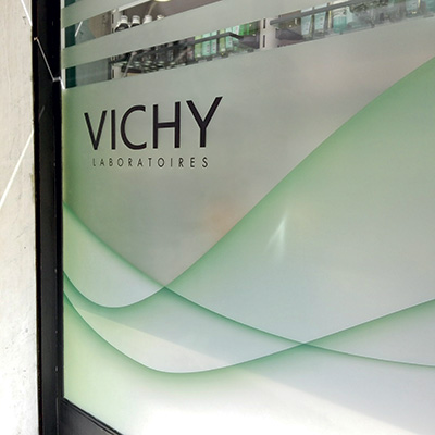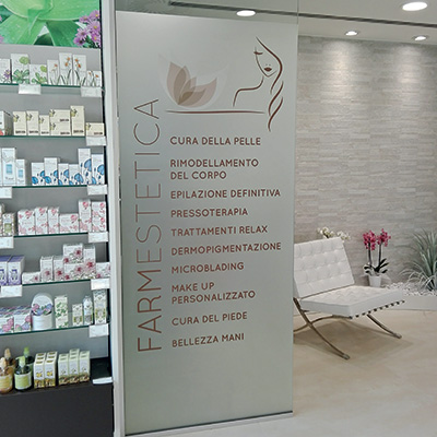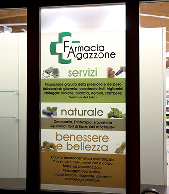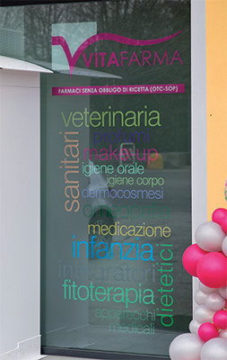 Vetrofanie posate dall’interno delle vetrine per comunicazione di servizi, comparti, orari ecc.